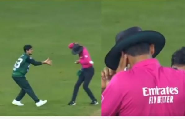 घटना पाकिस्तान की गेंदबाजी के दौरान छठे ओवर में घटी। सैम अयूब उस समय गेंदबाजी कर रहे थे, और यूएई के बल्लेबाज ध्रुव पराशर ने एक शॉट मिडविकेट की दिशा में खेला, लेकिन रन नहीं लिया। गेंद विकेटकीपर मोहम्मद हैरिस के पास गई, जिन्होंने फुर्ती से गेंदबाज अयूब की ओर फेंकी। दुर्भाग्य से, गेंद सीधे अंपायर के सिर पर जा लगी।